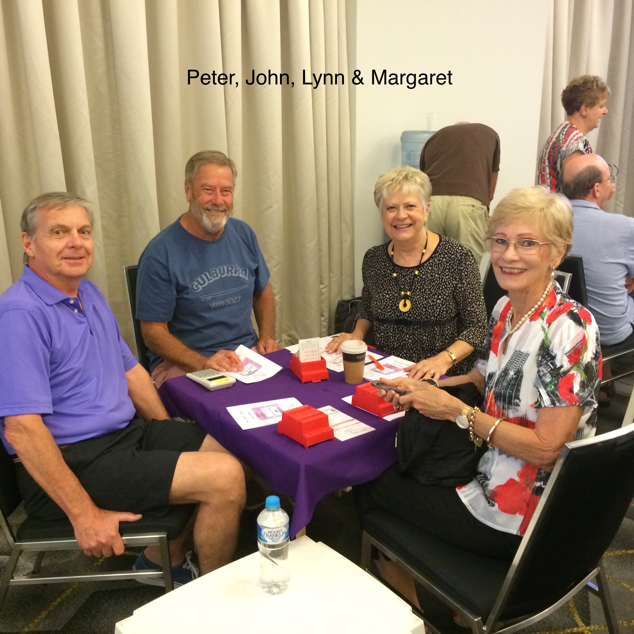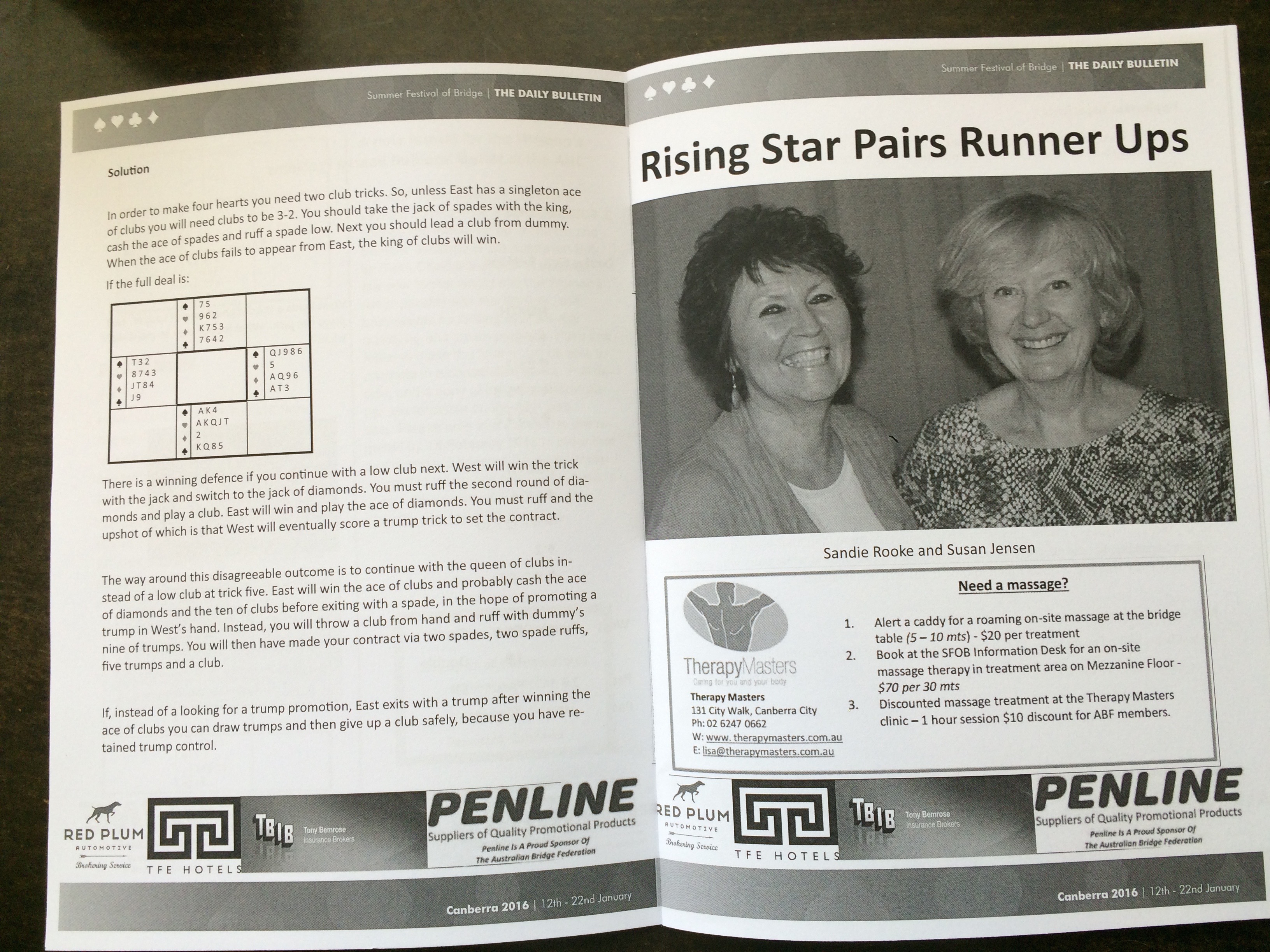 Week one of the Canberra congress has been very well represented by Peninsula members. We have seen some wonderful results especially from some of the newer and novice members who have come through our bridge education. Heidi Colenbrander and Ray Hurst came 3rd in the 0-20 Super Novice Pairs and Susan Jensen and Sandie Rook 2nd in the 20-50 Rising Stars Pairs. We had two teams in the Super Novice Teams event which was played over two days. There were 14 teams in this event and the Van Weeren team of Hans, Tom Wykoff, Heidi & Ray came 2nd, and the Rooke team of Sandie, Susan Jensen, Jen Ardill and Suzanne Cole took 4th spot. In the pairs datum Hans & Tom came in 3rd with Jen & Suzanne in 5th spot.