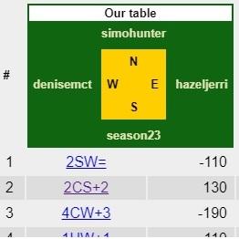 After a recent experience of being surprised how a passed in hand was scored, I thought I would share it with you. I naively had the idea that more or less the two pairs would get the same (middling) score but that is not quite how it works.